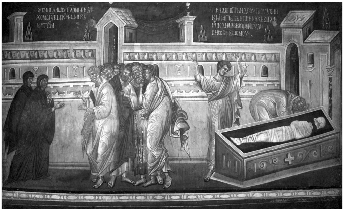 Жены-мироносицы и апостолы у пустого Гроба Господня. Фреска. Монастырь Грачаница, Сербия. XIV в.