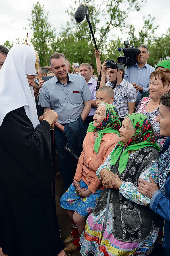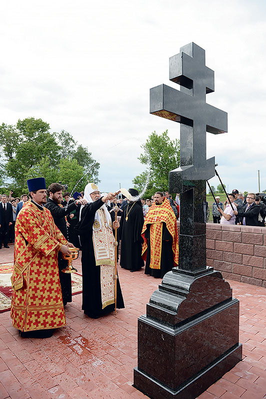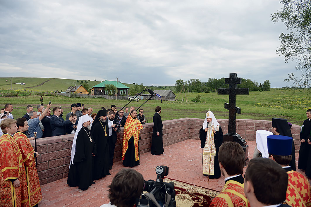 Святейший Патриарх Кирилл освятил памятный крест на месте бывшего Петропавловского храма в с. Уса-Степановка Благовещенского района Республики Башкортостан. 4 июня 2016 г.