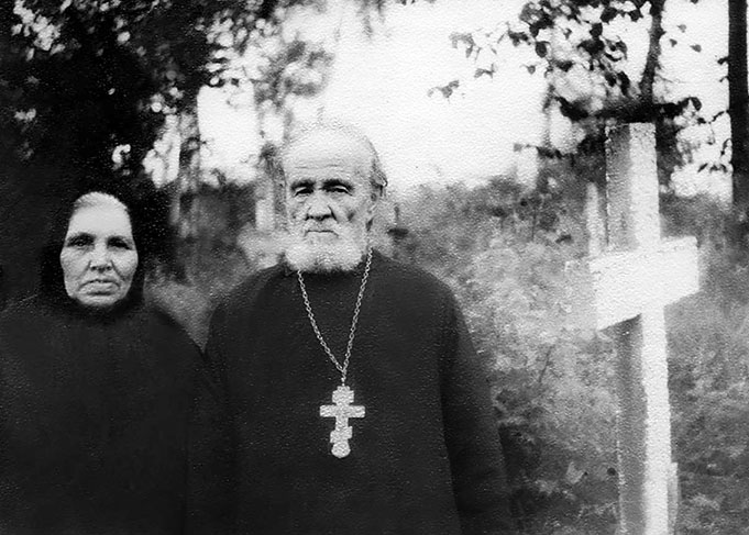 Священник Василий Гундяев с супругой Параскевой Ивановной на кладбище в с. Оброчном. 1960-е гг.