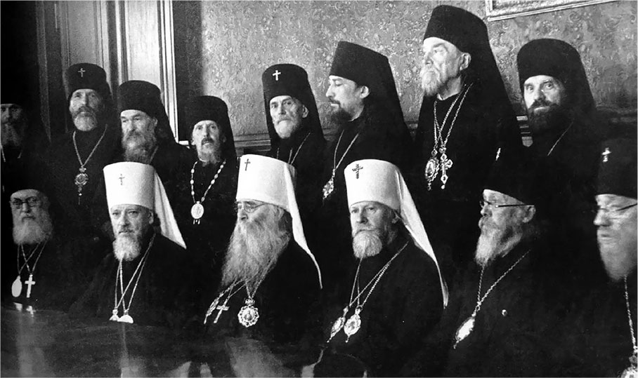 Митрополиты Сергий (Страгородский), Алексий (Симанский) и Николай (Ярушевич) (в центре) в период заседания Архиерейского Собора 1943 г.