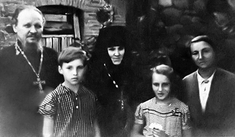 Слева направо: протоиерей Михаил Гундяев, его сын Владимир, будущий Святейший Патриарх Кирилл, игумения Пюхтицкого монастыря Ангелина (Афанасьева), дочь Елена, матушка Раиса. 1950-е гг.