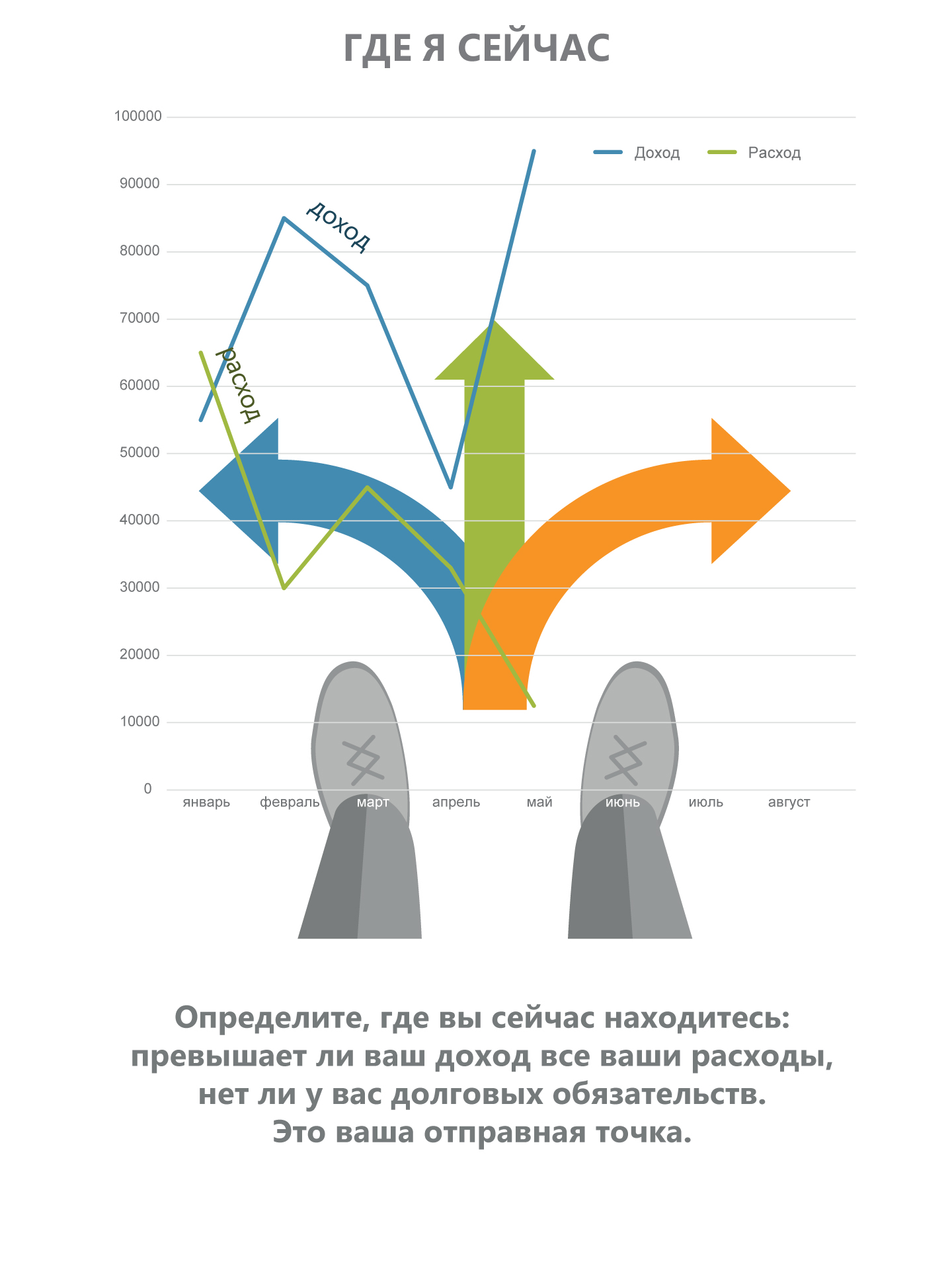 Осознание своих желаний и способов их достижения и есть точка отсчета «Где я сейчас» и то «Чего я хочу достичь». Планируйте достижение своих целей. Создавайте «подушку безопасности». Создавайте накопления для перехода на новую ступень финансового благополучия.