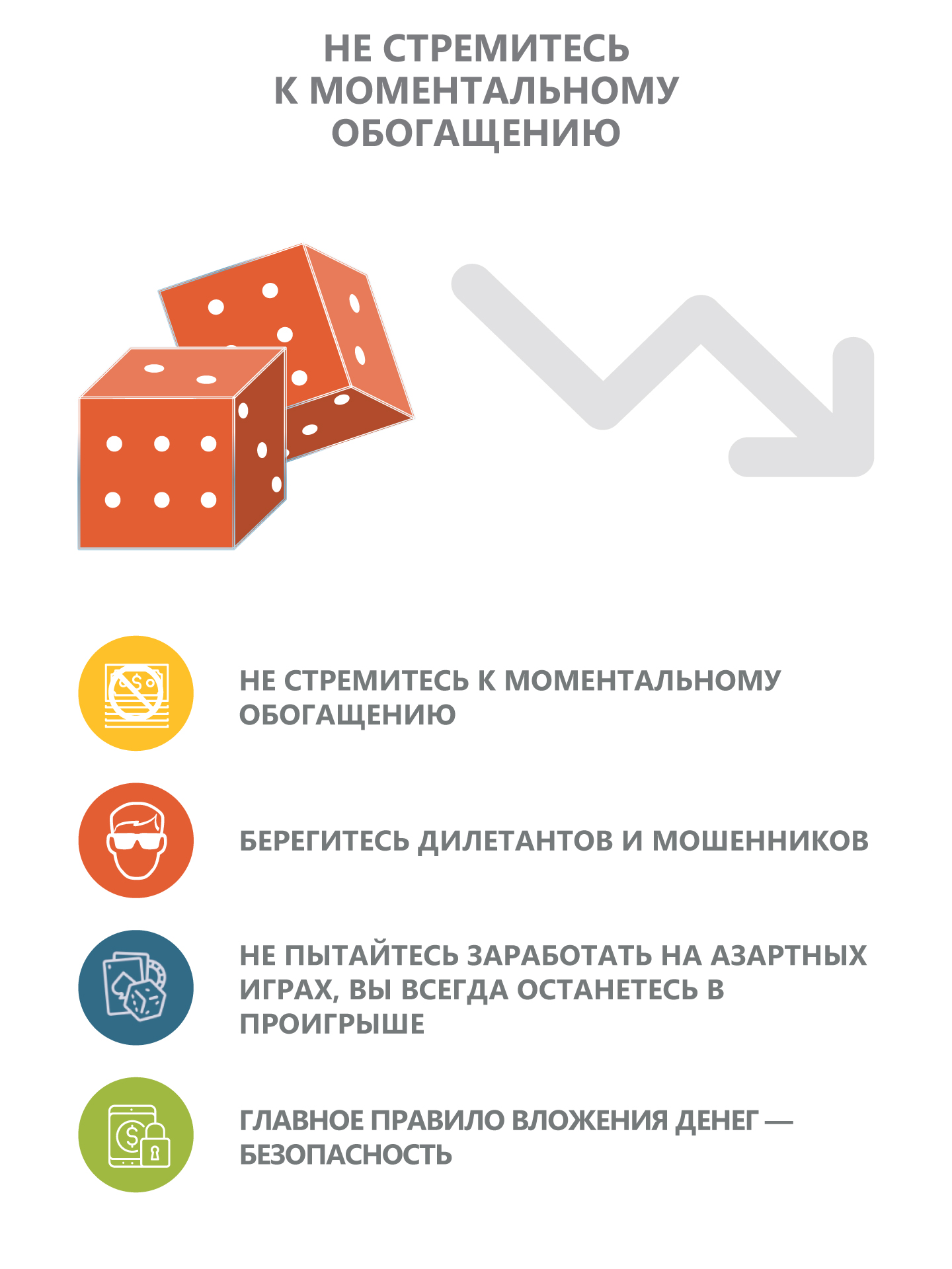 Большинство людей думают о том, как заработать больше денег, но у талантливых инвесторов другой подход: они в первую очередь стремятся избежать потерь. Чем больше денег вы потеряете, тем труднее их вернуть. Идея о том, что только большие риски приносят большую выгоду, – миф. Успешные инвесторы ищут возможности, в которых риски не столь велики, а прибыль значительна. Мы склонны стремиться получить больше в максимально короткие сроки, а маленькие постепенные изменения, которые преумножатся со временем, нас не устраивают. Лучший способ преуспеть в инвестировании – достичь устойчивых долгосрочных результатов. Но это так непросто, особенно если окружающие богатеют быстрее, чем вы. Берегитесь дилетантов и мошенников. Не пытайтесь заработать на азартных играх, вы всегда останетесь в проигрыше. Лучше идти к финансовому благополучию небольшими шагами, при этом рискуя минимально, чем стремительно двигаться к нему, рискуя многим. Контроль рисков важнее, чем гонка за прибылью. Основные риски – это действия на грани закона, плохое качество продукции, низкий уровень сервиса, непрофессиональная команда и отсутствие системной работы.