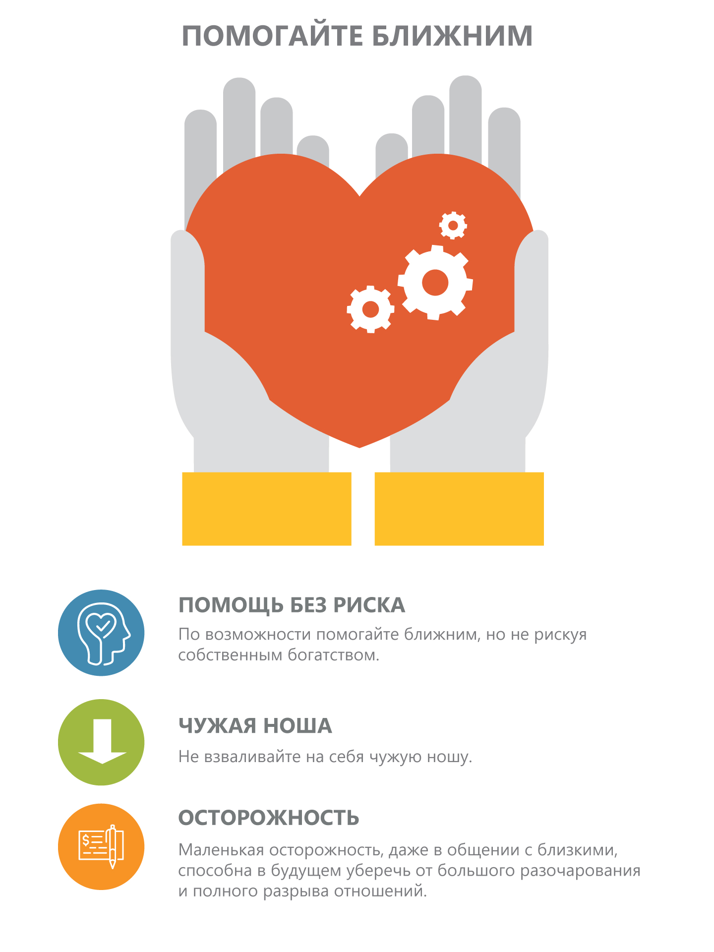 Преуспевающий человек – не тот, кто может купить средневековый замок и дорогую машину или яхту. Это тот, кто не только уверен в собственной финансовой безопасности до конца жизни, несмотря на курсы валют, финансовые кризисы, ситуацию на рынках акций и недвижимости, но и помогает другим людям, которые не столь успешно справляются с трудностями. По возможности помогайте ближним, но не рискуя собственным богатством. Даже если хотите помочь другу, ради своего благополучия и вашей дружбы, не взваливайте на себя его ношу. Никто не имеет права требовать, чтобы мы отдали ему то, что честно заработали. Маленькая осторожность, даже в общении с близкими, способна в будущем уберечь от большого разочарования и полного разрыва отношений. Но, оказывая посильную помощь, вы тоже осуществляете инвестицию. Возможно, то, чем вы помогли ближнему, вернется к вам сторицей.