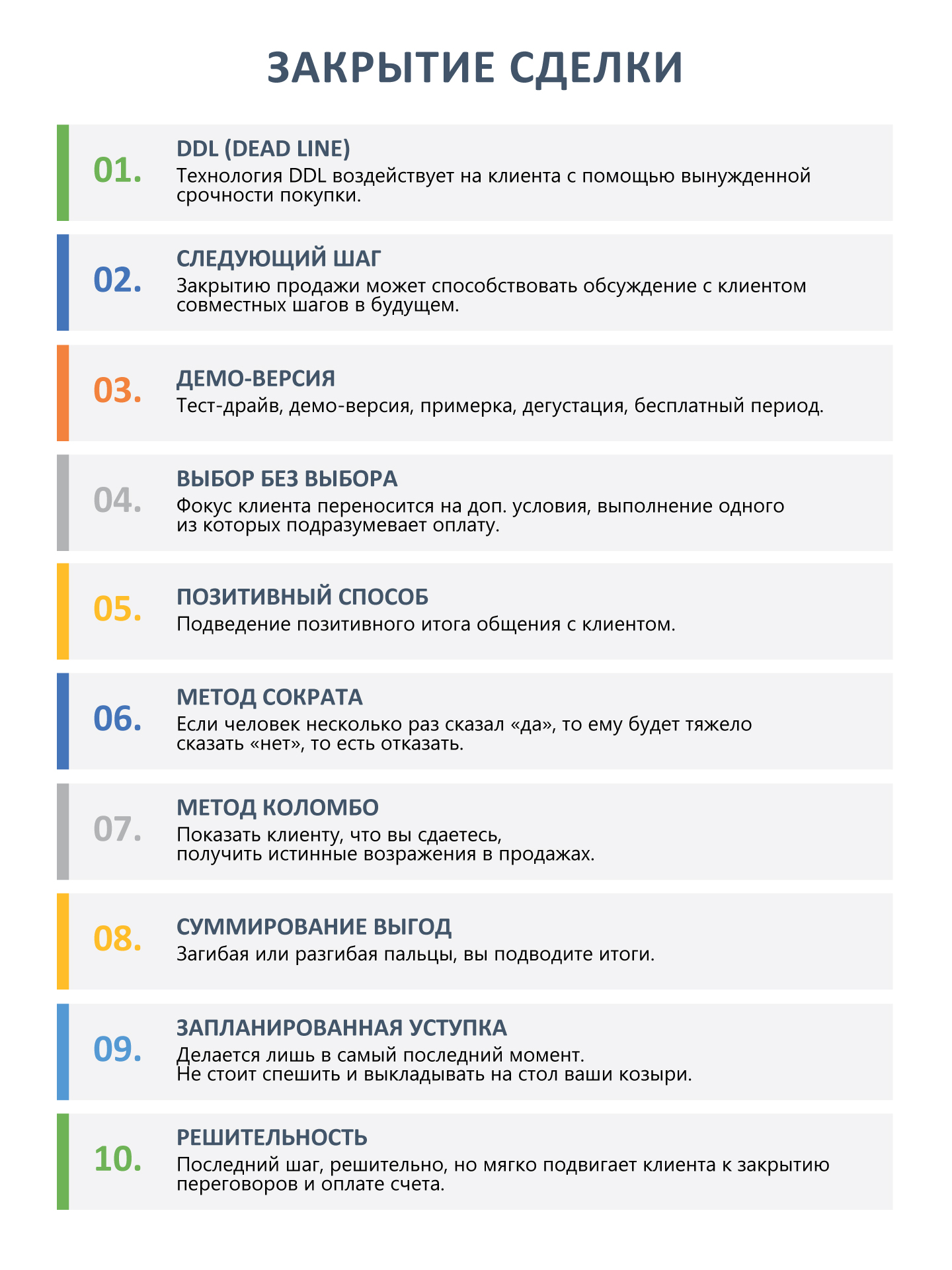 ЗАКРЫТИЕ СДЕЛКИ: DDL (DEAD LINE). Технология DDL воздействует на клиента с помощью вынужденной срочности покупки. Ограничьте возможности клиента в получении продукта/товара/сервиса/решения по времени и доступности. Для этого полезно будет использовать в своих фразах следующие слова: