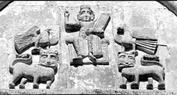 В руках у Русского Христа русские гусли. Нос Христа заменили на этот киль при реставрации в конце 20 века. Никто даже не заметил, что здесь изображено Учение Христа в камне. Всё подарили, вместе с Христом, гуслями, львами и голубями мифическому пастуху из X века до н.э.