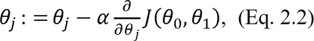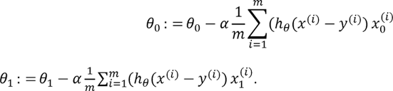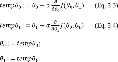 При этом шаги алгоритма выполняются так, что вначале происходит одновременное изменение обоих параметров на основании выражения 2.2 и только затем использование их для расчета новых значений функции стоимости. Другими словами, алгоритмическая последовательность одного из шагов цикла для случая двух параметров, выраженная на псевдокоде, будет следующей: