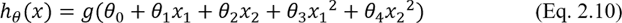 Функция hθ(x) может рассматриваться как вероятность того, что объект является «позитивным» (hθ(x)≥0.5) или «негативным» (hθ(x)<0.5). В сложных случаях, требующих нелинейной границы разделения, например, в виде окружности (рисунок 2.6), необходимо добавить дополнительные параметры, например, квадратные степени исходных параметров: