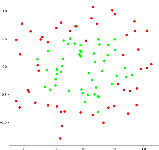 В результате получим на тренировочном множестве значение accuracy = 0.57, а на тестовом 0.4. Другими словами, точность предсказания нашей функции хуже, чем при случайном выборе классов! Подобный результат вполне предсказуем, поскольку мы попытались использовать прямую там, где требуется как минимум окружность.