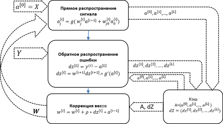 где W[i] – матрица весов i-го слоя нейронной сети; X – матрица обучающих примеров размерностью n x m (n – число параметров, m – количество обучающих примеров).