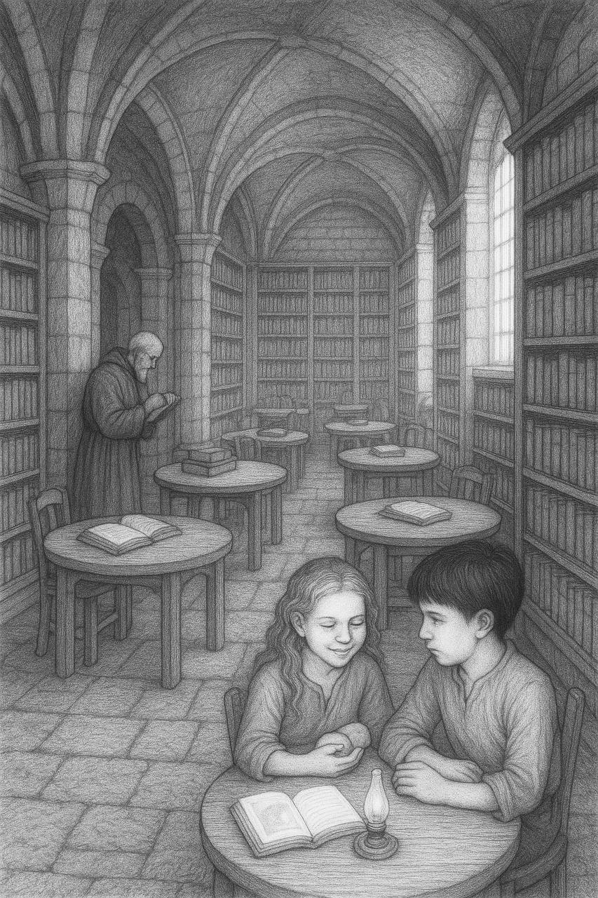 Дети рванули с места и помчались сквозь книжные стеллажи к лестнице. Подбежав ближе, они услышали громкие крики жителей и звон колоколов.