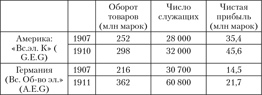 Таким образом сложились две электрические «державы»: «других, вполне независимых от них, электрических обществ на земле нет», – пишет Гейниг в своей статье: «Путь электрического треста». О размере оборотов и величине предприятий обоих «трестов» некоторое, далеко не полное, представление дают следующие цифры: