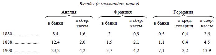 В деле обобществления капиталистического хозяйства конкуренцию банкам начинают оказывать сберегательные кассы и почтовые учреждения, которые более «децентрализованы», т. е. захватывают в круг своего влияния большее количество местностей, большее число захолустий, более широкие круги населения. Вот данные, собранные американской комиссией, по вопросу о сравнительном развитии вкладов в банки и в сберегательные кассы[32]: