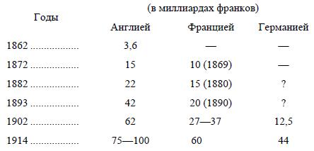 Мы видим отсюда, что гигантского развития вывоз капитала достиг только в начале XX века. Перед войной вложенный за границей капитал трех главных стран достигал 175–200 миллиардов франков. Доход с этой суммы, по скромной норме в 5 %, должен достигать 8–10 миллиардов франков в год. Солидная основа империалистского угнетения и эксплуатации большинства наций и стран мира, капиталистического паразитизма горстки богатейших государств!