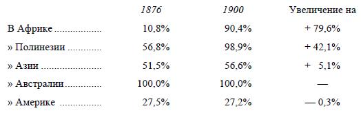 Мы переживаем, следовательно, своеобразную эпоху всемирной колониальной политики, которая теснейшим образом связана с «новейшей ступенью в развитии капитализма», с финансовым капиталом. Необходимо поэтому подробнее остановиться прежде всего на фактических данных, чтобы возможно точнее выяснить как отличие этой эпохи от предыдущих, так и положение дела в настоящее время. В первую голову возникают здесь два фактических вопроса: наблюдается ли усиление колониальной политики, обострение борьбы за колонии именно в эпоху финансового капитала и как именно поделен мир в этом отношении в настоящее время.
