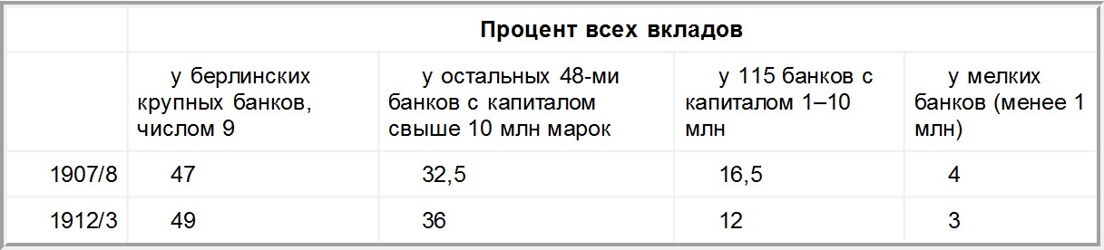 В 1907/8 г. вклады всех акционерных банков Германии, обладавших капиталом более 1 млн марок, составляли 7 млрд марок; в 1912/3 г. – уже 9,8 млрд. Увеличение на 40 % за пять лет, причем из этих 2,8 млрд увеличения 2,75 млрд приходится на 57 банков, имевших капитал свыше 10 млн марок. Распределение вкладов между крупными и мелкими банками было следующее[22].