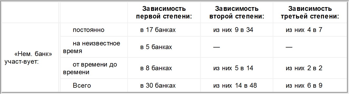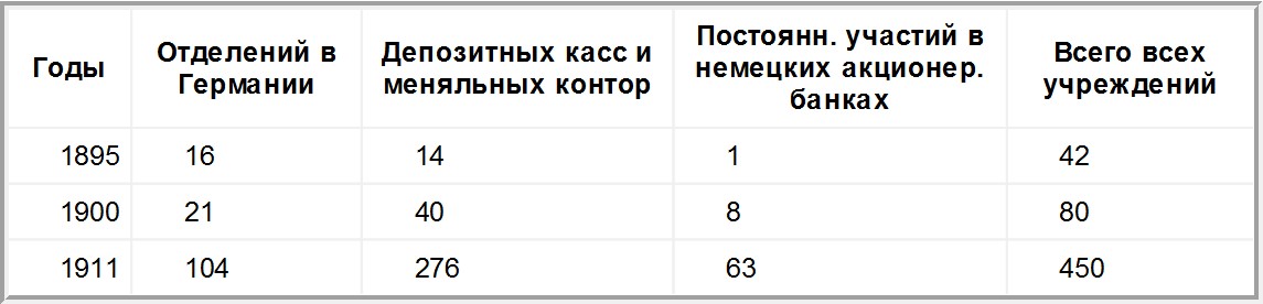 В число 8-ми банков «первой степени зависимости», подчиненных «Немецкому банку» «от времени до времени», входит три заграничных банка: один австрийский (венский «Банковый союз» – «Bankverein») и два русских (Сибирский торговый и Русский банк для внешней торговли). Всего в группу «Немецкого банка» входит, прямо и косвенно, целиком и отчасти, 87 банков, а общая сумма капитала, своего и чужого, которым распоряжается группа, определяется в 2–3 млрд марок.