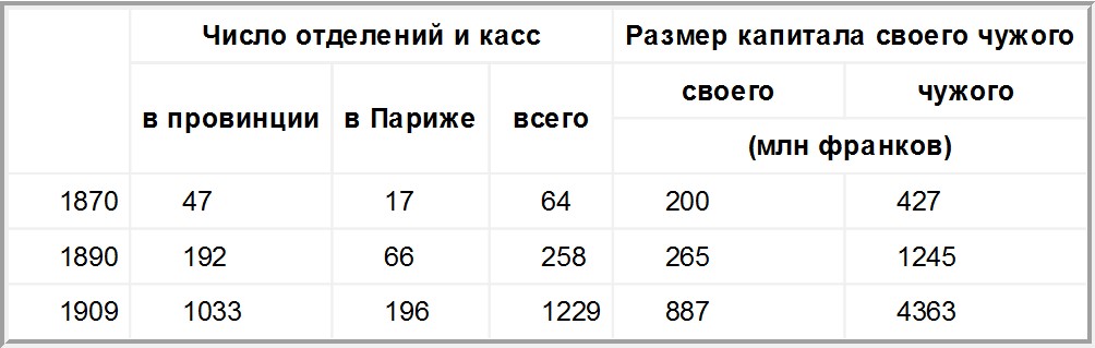 Во Франции три крупнейших банка, «Credit Lyonnais», «Comptoir National» и «Societe Generale»[26], развивали свои операции и сеть своих отделений следующим образом[27]: