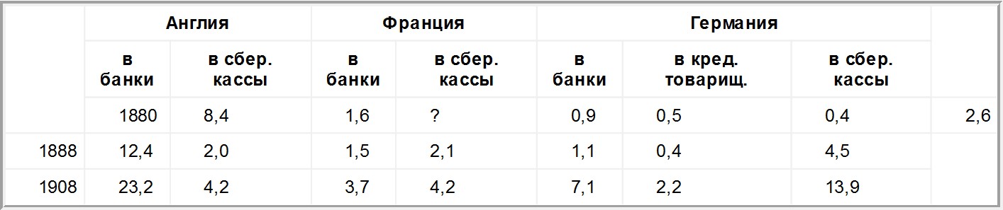 В деле обобществления капиталистического хозяйства конкуренцию банкам начинают оказывать сберегательные кассы и почтовые учреждения, которые более «децентрализованы», т. е. захватывают в круг своего влияния большее количество местностей, большее число захолустий, более широкие круги населения. Вот данные, собранные американской комиссией, по вопросу о сравнительном развитии вкладов в банки и в сберегательные кассы[31]: