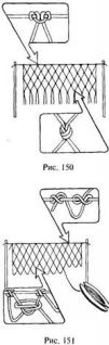 распустив на отдельные нити капроновый канат, буксирный конец или, применяя терминологию альпинистов, основную веревку. Толстые капроновые веревки почти всегда сплетены из множества отдельных жил, вполне пригодных для плетения сетей. Способы плетения сетей показаны на рис. 150, 151.
