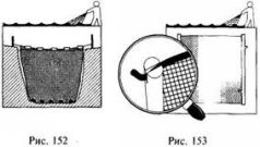 В центре построенной тем или иным способом сети оставляется узкий проход, ниже которого, за ловушкой из тех же расправленных на жердях сетей или кольев, сооружается небольшой садок-загон треугольной, квадратной или любой другой формы. Вход имеет форму воронки, углубленной примерно на треть внутрь садка. Попавшая в ловушку крупная рыба не может отыскать путь назад, скапливаясь в тупиковых карманах, и рыбаку остается добыть ее с помощью остроги или отловить руками (рис. 157).