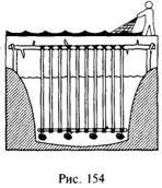 Мелкие, со слабым течением реки можно перегораживать упрощенной моделью сети, состоящей из одних только вертикальных полос. Для этого тонкие полосы лыка через равные расстояния привязываются концами к двум прямым жердям. Одна жердь, утяжеленная камнями, укладывается на дно реки, другая поднимается над водой на вертикальных кольях, заканчивающихся развилками. Таким образом водный поток оказывается перерезанным частыми вертикальными полосами, через которые рыба пройти не может (рис. 154).