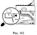 Тот же принцип можно использовать на реках с единым руслом. Для этого часть потока надо перегородить примитивной сетью и направить рыбу внутрь длинного, устроенного параллельно берегу рукава-садка. В тупиковой части садка надо выкопать загон-ловушку в форме глубокой ямы, соединенной с рекой узким длинным канальцем. Когда рыба попадет в садок, ее надо, производя как можно больше шума, загнать в ловушку и закрыть из нее выход (рис. 163).