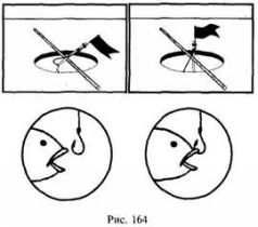 К нижнему концу планки-сторожка, опущенному в воду, привязывается леска с крючком и наживкой, к верхней – сигнальный флажок. Клюнувшая рыба дергает за леску и приподнимает дальний конец планки с флажком, что сигнализирует о поклевке (рис. 164).