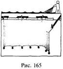 Сети зимой устанавливаются поперек течения реки в большой полынье или расправляются через несколько малых лунок, как показано на рис. 165.
