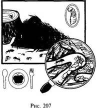 Наиболее питательны не сами муравьи, а их личинки и куколки (или, как их иногда называют, муравьиные яйца), напоминающие внешним видом белые или желтые рисовые зерна. Личинки можно насобирать, разворошив стену большого муравейника. В малых муравейниках бывает достаточно приподнять камень или ствол дерева, прикрывающий его сверху, чтобы отыскать целую залежь муравьиных яиц (рис. 207).
