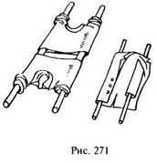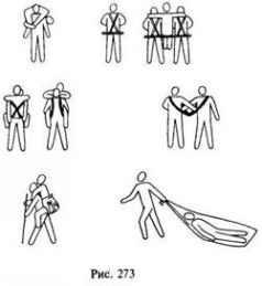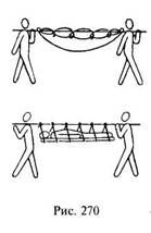 Перенос на жердине (рис. 270). В подвешенном под жердью тканевом гамаке переносятся пострадавшие, не имеющие переломов, открытых ран и переломов и повреждений позвоночника.