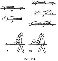 При транспортировке следует придать пострадавшему позу (а при необходимости зафиксировать), рекомендованную при тех или иных болезнях (рис. 274):
