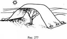 Простейший тент представляет из себя кусок ткани, наброшенный сверху на куст и подвязанный в нескольких местах к веткам (рис. 277). Можно растянуть тент над небольшой ямой-углублением в почве или наискосок, вдоль обрыва крутого бархана (рис. 278).