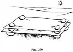 При устройстве долговременных биваков и при использовании тонкой просвечивающей ткани можно устанавливать двойные тенты, для чего над углублением в почве растянуть один кусок ткани, прижать его в нескольких местах по периметру и углам насыпанным песком и камнями и сверху, в 30—50 см, растянуть еще один тент, закрепив таким же образом (рис. 279).