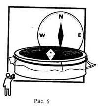 Чтобы пользоваться компасом постоянно, нужно рабочую поверхность закрыть защитным стеклом. Для этого в коре или пенопласте вырезать углубление, диаметром превышающее на 1-2 мм длину стрелки с таким расчетом, чтобы стрелка, насаженная на ось, на 0,5-1 мм оказалась ниже среза шкалы. Это необходимо для того, чтобы стрелка с одной стороны не цеплялась за шкалу при вращении, с другой – не тормозилась прижавшим ее сверху защитным стеклом. Рабочая плоскость закрывается осколком любого стекла, посаженным на смолу, или затягивается обрывком прозрачной полиэтиленовой пленки, которая закрепляется на ребре компаса с помощью круговой нити или резинки. Пленка защитит компас от воды, ветра и одновременно не даст возможности стрелке соскочить с оси. Роль тормоза может выполнять нить или тонкая резинка, натянутая поверх пленки, и подложенный под нее кусочек пробки, пенопласта, коры, резинки, упирающийся в центр стрелки (рис. 6).