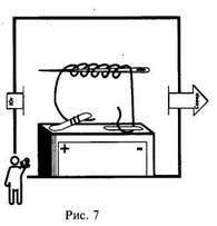 В аварийных условиях можно для этой цели использовать магнит, находящийся в динамике любого переносного приемника, в наушниках аудиоплейера или попытаться намагнитить иголку с помощью электричества. Для этого необходимо иметь источник питания (батарейку, аккумулятор, солнечную батарейку от мощного калькулятора или другого переносного электронного прибора, фонарик-жучок и т. п.) с напряжением не менее 2 В (некоторые источники указывают 6 В), а также кусочек проволоки в изоляции. При работе с лаковой изоляцией следует соблюдать максимальную осторожность, так как она легко повреждается. Если проволока голая, то иголку перед намагничиванием следует обернуть в несколько слоев сухой бумаги, полиэтиленовой пленки или другого изолирующего материала. Проволока наматывается витками вокруг иголки и присоединяется к клеммам батареи на несколько (желательно не меньше чем на 10) минут (рис. 7).