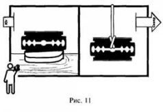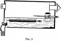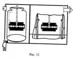 Работа с бритвенными лезвиями усложняется тем, что, в отличие от иголок, они имеют значительную площадь и потому очень чутко реагируют на любое дуновение ветерка, всякое движение и даже дыхание человека. Не обеспечив магнитному лезвию абсолютный покой в защищенном от сквозняков месте, невозможно ожидать от него надежного результата измерений! Поэтому подвешивать его лучше в стеклянной банке или пластиковой бутылке с отрезанной горловиной, либо в растянутом на колышках в положении вверх дном полиэтиленовом мешке, пропустив внутрь него нитку через небольшое, прорезанное в дне отверстие (рис. 12).