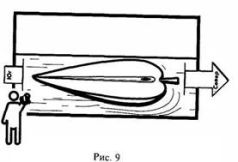 Наконец, можно аккуратно уложить на кусок бумаги или лист дерева, плавающий на поверхности воды (рис. 9), или просто подвесить на тонкой нитке, затянув в точке равновесия небольшой петлей, или воткнуть в заранее завязанный на конце узелок (рис. 10).