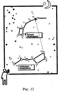 ОРИЕНТИРОВАНИЕПо звездам. Полярная звезда – последняя в «ручке ковша» созвездия Малая Медведица – всегда указывает на север (рис. 13). Отыскать ее можно, мысленно продолжив линию, соединяющую две крайние звезды в ковше созвездия Большая Медведица и отложив на ней пять отрезков, примерно равных расстоянию между этими звездами. Точность определения этим способом может достигать 3-4°.