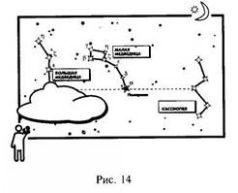 В ситуации, когда созвездие Большая Медведица закрыто облачностью или расположено слишком низко на небе, отыскать Полярную звезду может помочь созвездие Кассиопея. Оно расположено почти всегда против созвездия Большая Медведица и так же, как и оно, вращается вокруг Полярной звезды. Созвездие Кассиопея состоит из пяти ярких звезд, напоминающих сильно сплюснутую букву «М». Полярная звезда расположена прямо против центральной звезды созвездия примерно на том же расстоянии, что и от Большой Медведицы (рис. 14).