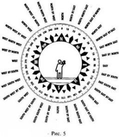 Для упрощения работы с импортными компасами можно общее количество румбов разделить на четыре (по сторонам света) и соотнести с привычной нам градусной шкалой (рис. 5).