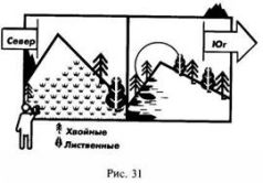С другой стороны, в горах существуют специфические, применимые только там, способы аварийной ориентировки. Например, направление на север можно приблизительно определить по внешнему виду горных склонов. Так, если на одном склоне густо растет дуб, а на другом – бук, то первый почти всегда обращен к югу, второй – к северу. Дуб и сосна чаще покрывают южные склоны, ель, пихта – северные. Иначе говоря, тепло– и светолюбивые деревья тяготеют к склонам, обращенным к югу, холодостойкие – к северным. Лес и луга по южным склонам поднимаются выше, чем по северным (рис. 31). Южные склоны бывают суше северных, они менее задернованы и сильнее подвержены процессам размыва.