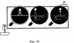 При наблюдении с земли можно заметить большие башни, церкви, элеваторы – за 16—20 км, населенные пункты общим контуром, то есть без внутренних деталей, – за 10—12, отдельные крупные здания и заводские корпуса – за 9, заводские трубы – за 6-8, а столбы дыма от них в некоторых случаях за 40 км и более. Небольшие отдельно стоящие дома и избы – за 5 км, телеграфные столбы, общий контур фигуры человека – за 1,5 км. При наблюдении с земли ночью возможно увидеть: зарево большого города и отблеск его огней на облаках за 70 км и более; светосильные маяки, расположенные на возвышенностях, – до 50 км; на таком же расстоянии различимы вертикальные лучи прожекторов. Фары автомобиля видны за 10 км, костры – за 8, а при наблюдении с воздуха – за 20 км. Сильный электрический фонарь – за 3-4 км, слабый – за 1,5, отблеск ружейных выстрелов – за 1,5 км(рис. 34).
