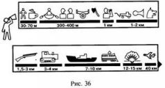 Если непонятный шум или искусственного происхождения звук человек услышал во время перехода или привала, он должен незамедлительно повернуться лицом в его сторону и, стараясь не двигаться, зафиксировать направление на звук, заметив перед собой какой-либо хорошо различимый ориентир – камень, скалу, одиночное дерево, в крайнем случае, вытянув руку. После этого следует некоторое время соблюдать полную тишину, так как существует вероятность повторения звука. Одновременно, не сходя с места и не прекращая прослушивания, надо на шкале компаса заметить градусы, соответствующие направлению на ориентир. В последующие часы, и особенно ночью, в данном направлении необходимо провести тщательное визуальное наблюдение.