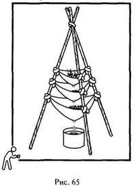 Более сложный фильтр можно соорудить из любой имеющейся в распоряжении ткани и жердей. Для этого жерди устанавливаются треногой, на которой на трех уровнях привязываются три куска ткани. Каждый такой импровизированный фильтр нагружается своим наполнителем. Например, верхний – травой, средний – песком, нижний – древесным углем, взятым из прогоревшего костра, сложенного из деревьев лиственных пород. Вода, свободно протекая через все слои, фильтруется и осветляется (рис. 65).