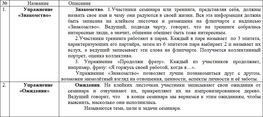 2. Отбор упражнений, методов, приёмов, техник. Проводим отбор, выбирая те виды деятельности, которые наиболее подходят к содержанию тренинга и достижению его целей.