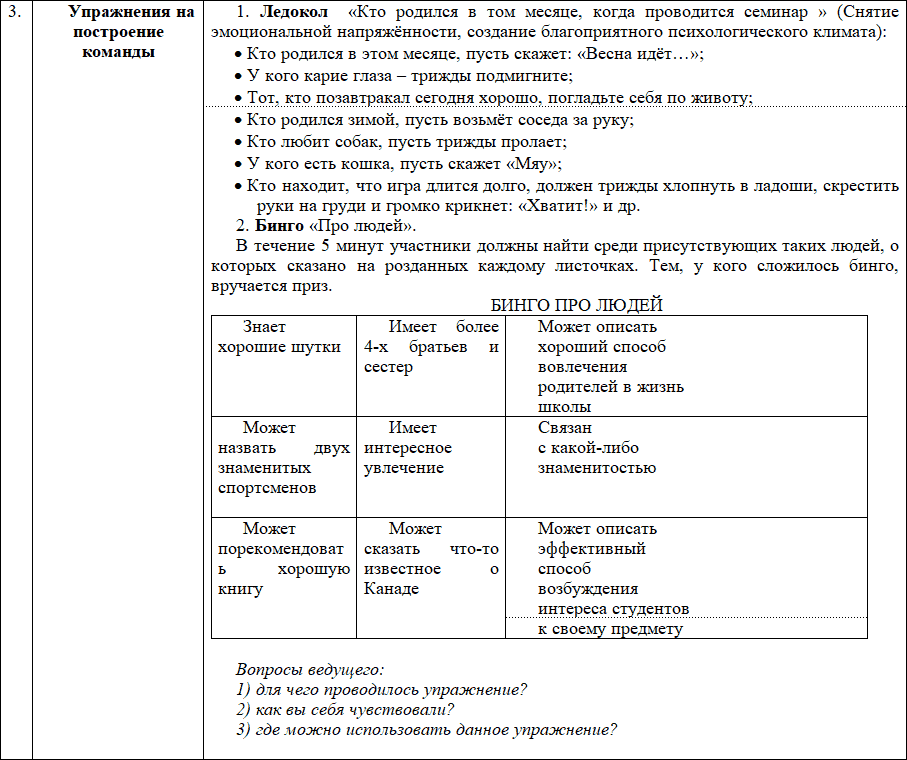 1. Проведение занятий (тренингов, деловых, ролевых игр и др.) с преподавателями по основным проблемам, выявленным в ходе диагностики. Структура каждого занятия состоит из трёх основных частей: теоретическая (мини-лекции); практическая, включающая отработку навыков интерактивного обучения; рефлексивная часть, включающая индивидуальную и групповую рефлексию.