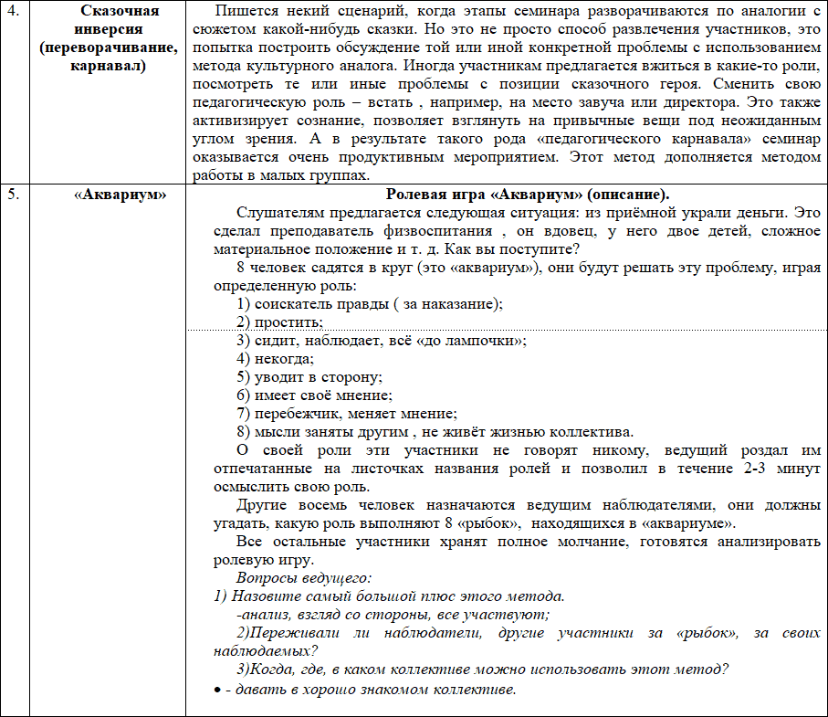 – Анализ конкретных педагогических ситуаций побуждает участников сделать какой-то свой выбор, они обсуждают пути решения ситуаций, учатся формулировать проблему, развивается умение слушать, тренируются профессиональные навыки, черты личности и др.;