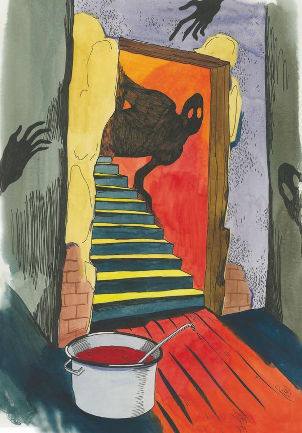 Ох, ведьма! Наверное, зелье колдовское варит! Стою тихо, прямо не дышу. Тётка крутит и крутит что-то в кастрюле, дым аж до меня поднимается. Поварёшка гигантская о стенки бряцает, и звук такой глухой от этого идёт по всей лестнице…