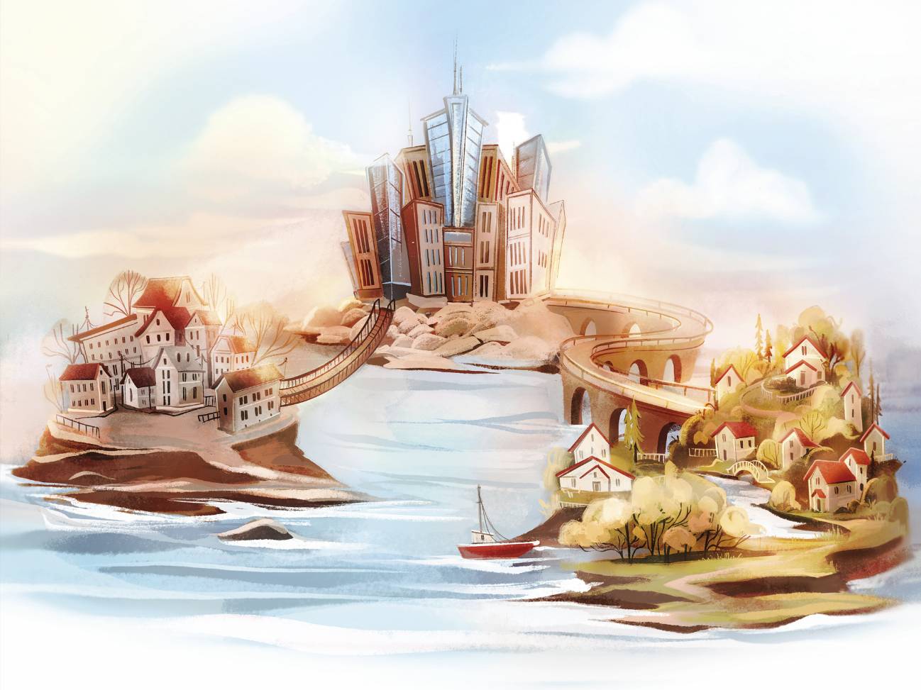 Она распахнула деревянные створки упаковки от игры, которые были сделаны как дверцы, и увидела перед собой большую игровую область похожую на карту. На ней был нарисован остров с высотными башенными зданиями расположенный почти посередине большого темно-синего моря. По краям от острова шли мосты, один из которых был очень узким и не вызывал доверия, но только по нему можно было добраться с левой части карты до острова. А с правой стороны был широкий и крепкий каменный мост, который соединял остров с красочной долиной, где повсюду виднелись красивые малоэтажные дома, высокие и пышные деревья, хвойные леса и небольшой пруд.